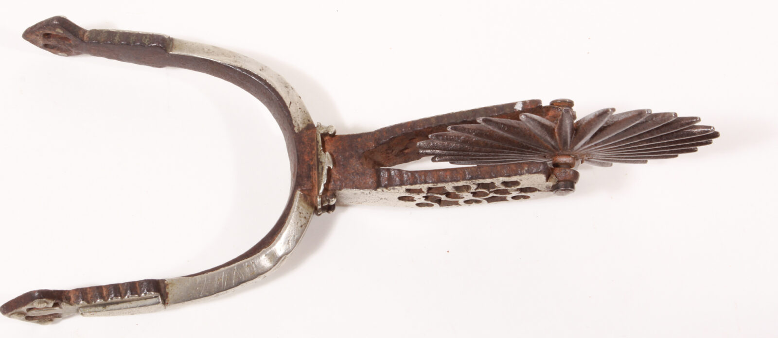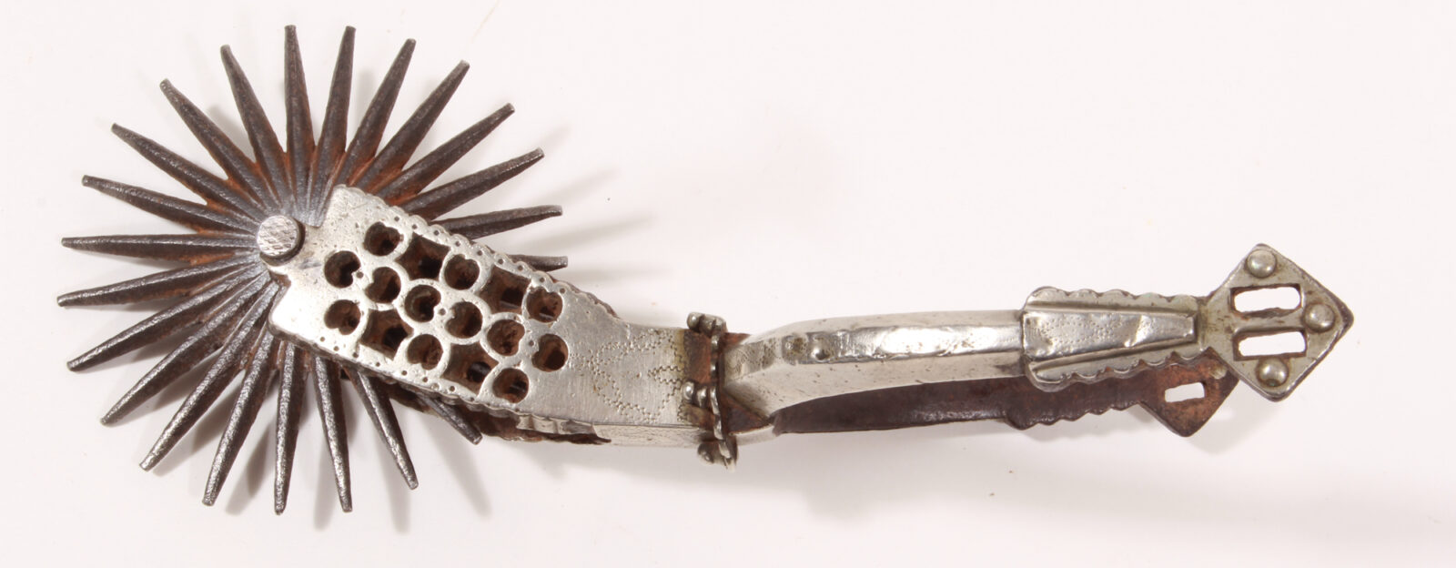 Forged iron, the exterior completely covered with silver sheet. The wheel housing is openwork in a heart shape. Multi-pronged wheel. Length 23 cm. Silver sheet with fine dents, some wear along the edges. See Barbarus Books “Der Sporn in seiner Formenentwicklung”, a comparable piece pictured on the cover. Dated in the text to the 18th century.
