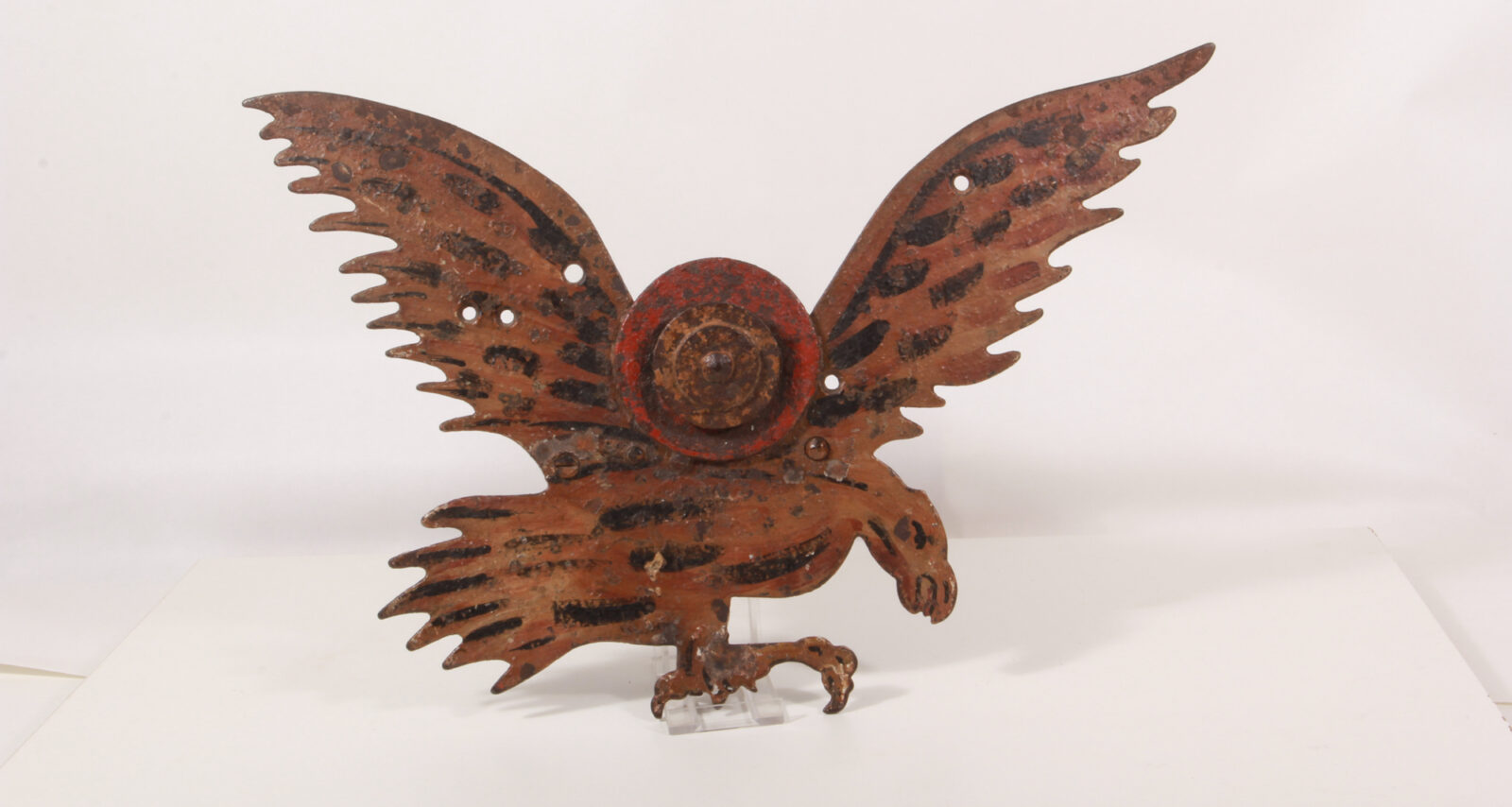 A sturdy target depicting a soaring eagle. A fixed red target field with a moving white target is positioned between the wings. The mechanism is designed so that a hook is located at the bottom of the claw, onto which the prizes to be shot are hooked. The shooter sees the prize being held by the claws and releasing from them upon impact. Length: 48 cm. A few minor paint chips due to hits on the target.