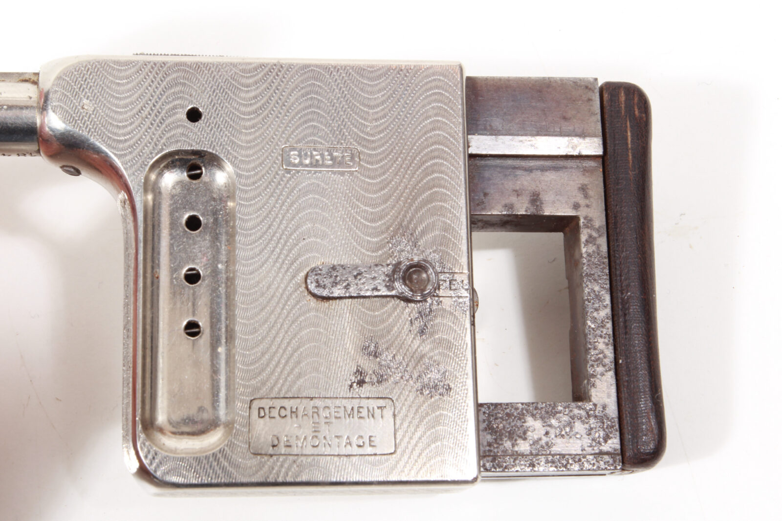 Barrel with flat rib, signed “Mitrailleuse” and silver beaded front sight, underside with serial number 1848. Side plates stamped with a wave pattern, sight holes to indicate loading capacity, safety lever that also serves as a disassembly position. Stamped “Manufacture Francaise d’Armes de St. Etienne”. Top with grooved ejector slide, reverse with repeating grip and black horn butt plate. Length 13 cm. Safety slide with cleaned rust pitting, fine pinholes in the nickel plating area of the safety slide, otherwise very good condition and function. Bright bore with four sharp rifling grooves.