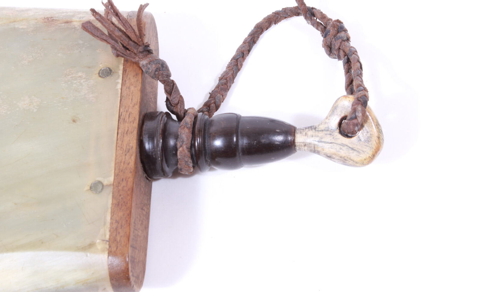 Flat, grained wooden body, wooden base and lid secured with horn dowels. Acorn-shaped spout of polished black buffalo horn. Stopper of light-colored antler, connected with a braided leather strap. Length 24 cm. Wooden base shows signs of wear, otherwise in very good condition.