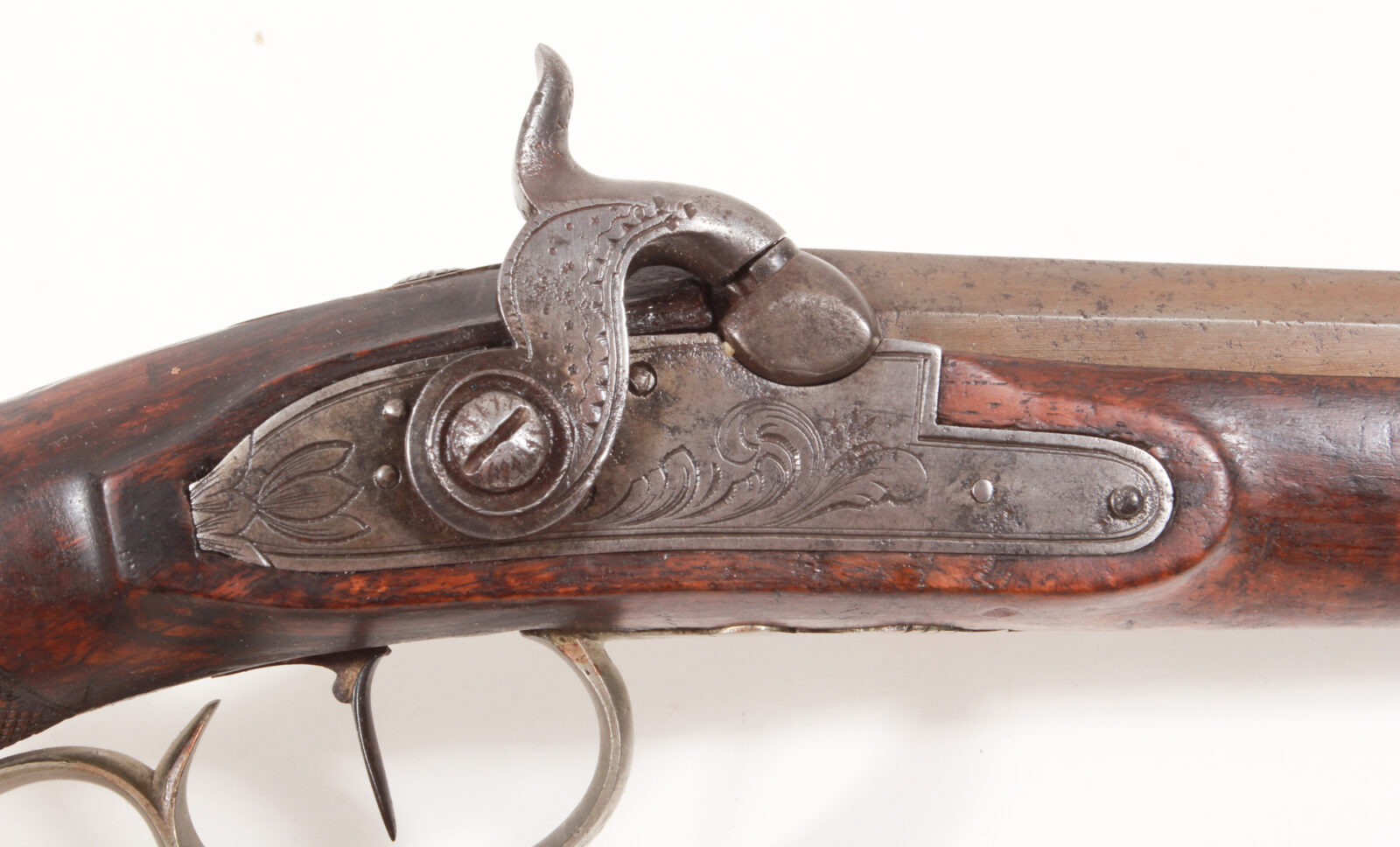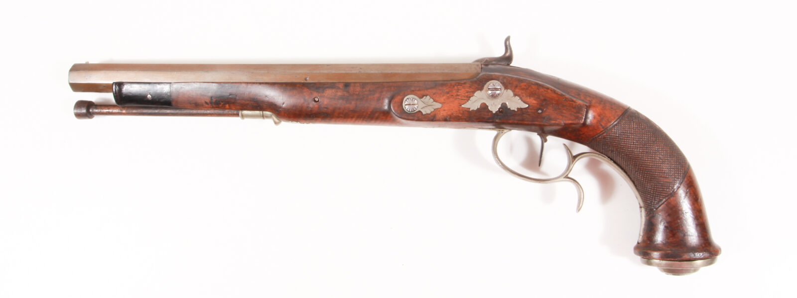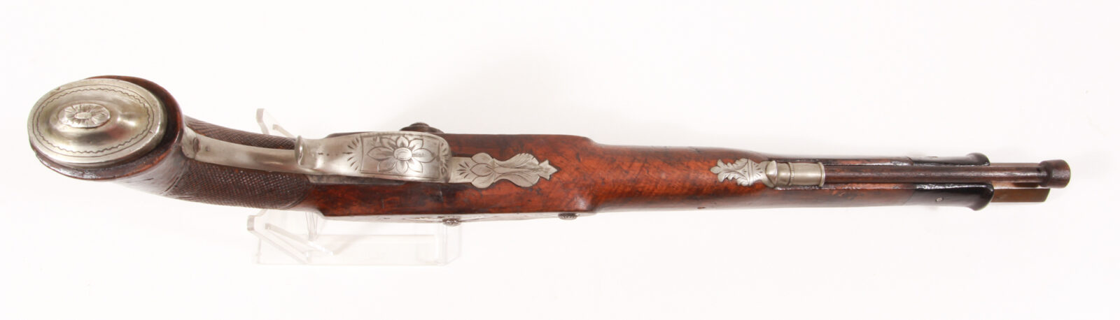 Octagonal barrel with silver front sight, rear sight, and engraved breechblock with serial number 5757. The lock features rim engraving and floral decoration. Nickel silver fittings, typical of Suhl, are engraved with floral decoration. Nickel silver buttplate. Checkered stock with ebony end. Added ramrod. Length 44 cm, barrel length 29 cm. Very good function, strong springs, clean detent. Slightly matte barrel with sharp, straight rifling.