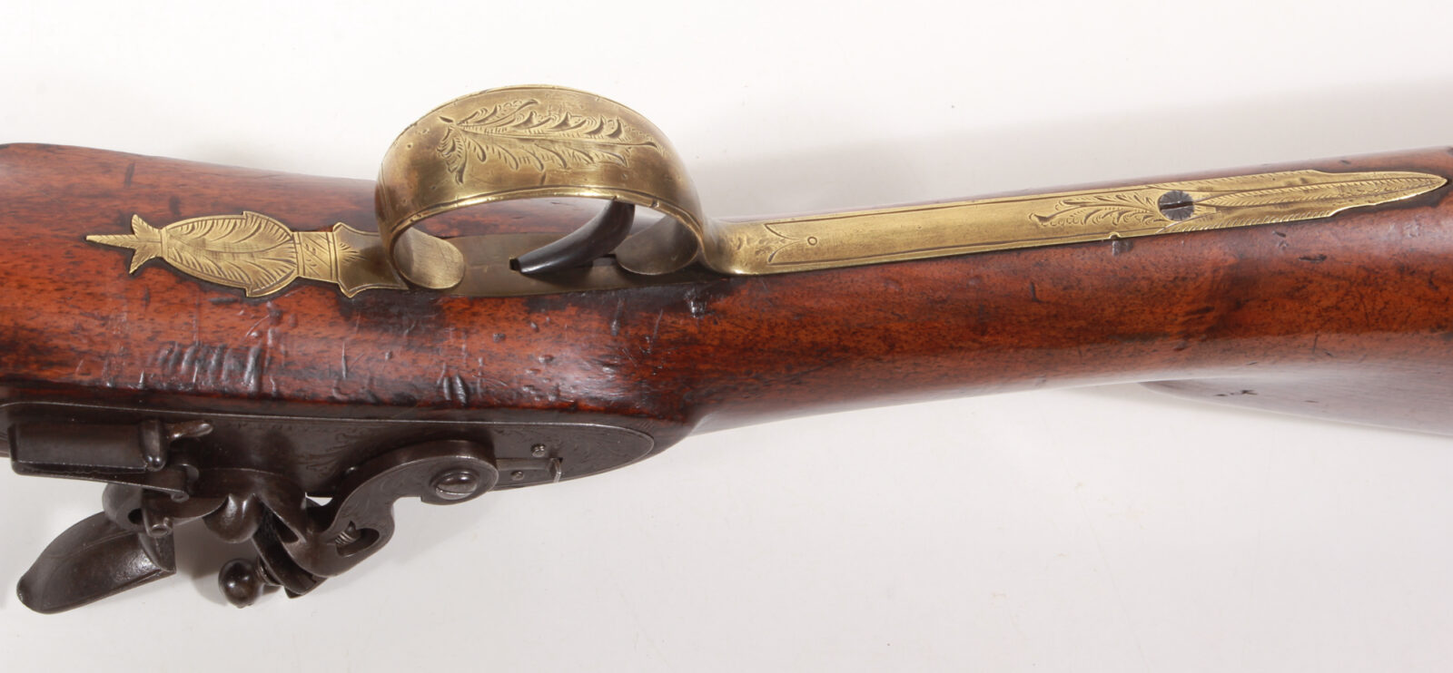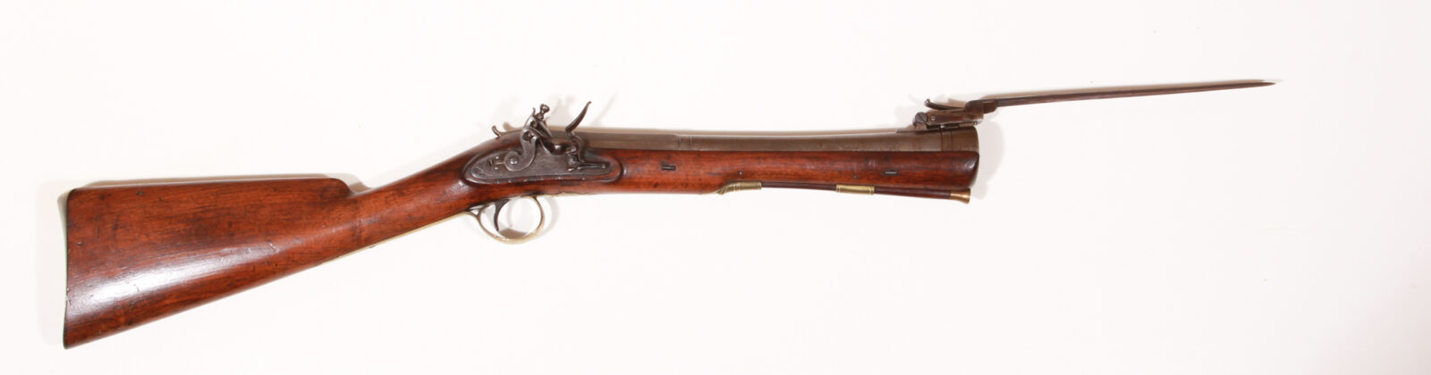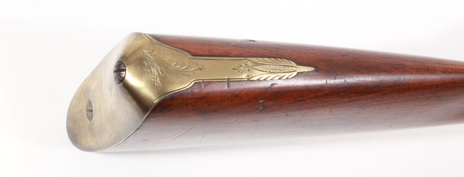 Octagonal chamber, transitioning to a round tromblon shape via balusters. Chamber signed “London” and bearing proof marks from the Birmingham Proof House. Breech plug with spring-loaded release for the bayonet mechanism. Triangular bayonet with a strong spring and a hinge for locking above the tromblon muzzle. Flat lock plate with a rainproof pan, frizzen spring with friction roller, cock with sliding safety. Lock plate and cock with fine acanthus engravings, signed “Gameson & Co.” Finely engraved brass fittings. Grained walnut stock with a silver monogram plate engraved with a rampant lion holding a scythe. Original ramrod with ball puller. Length 75 cm, barrel length 36 cm, 102 cm with bayonet extended. Bore still bright with minimal spotting and patina, visible old tool marks from manufacturing. Very good condition and function with strong springs. Gameson is mentioned at 67 Threatneedle Street, London, between 1824 and 1830 (S. Stöckel Vol. 1, p. 418).
