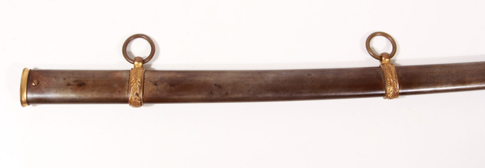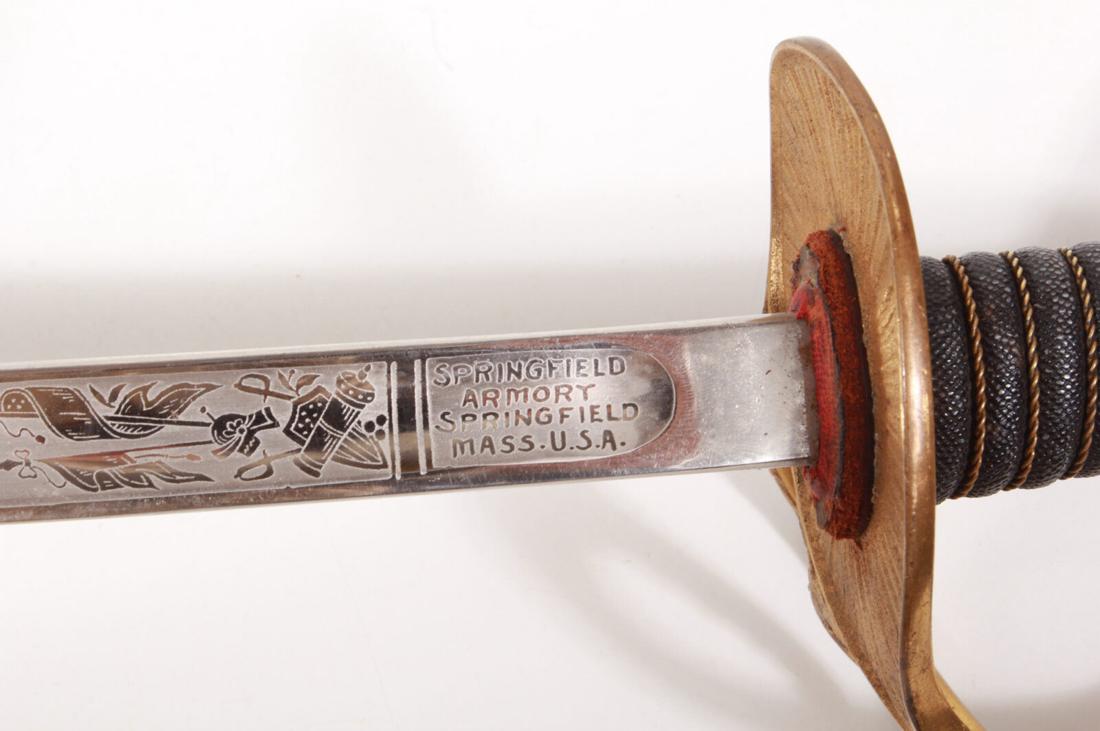 Single-edged saber blade with a wide fluting, a second, narrow fluting in the center, signed “Springfield Armory Springfield Mass. USA”. Fine blade etching signed “U.S.”, reverse with US eagle and motto between fine trophy etchings. Brass hilt with two bands, outer side with a radiant halo, inner side with eagle and stars. The pommel with foliage and US coat of arms. Hilt fire-gilded. Wooden grip covered with ray skin and brass wire wrapping. Steel scabbard with brass mouth and two movable carrying rings, drag with radiant decoration, all fire-gilded. Length 100 cm, blade length 86.6 cm. Based on the blade etching and the signature, the piece can be dated between 1900 and 1902; approximately 300 were produced per year. Steel scabbard with a very thin, glossy patina, otherwise in near-mint condition. See Burton Kellerstedt “Early Sword and Sabers of the Armory of Springfield” Fig. 20.