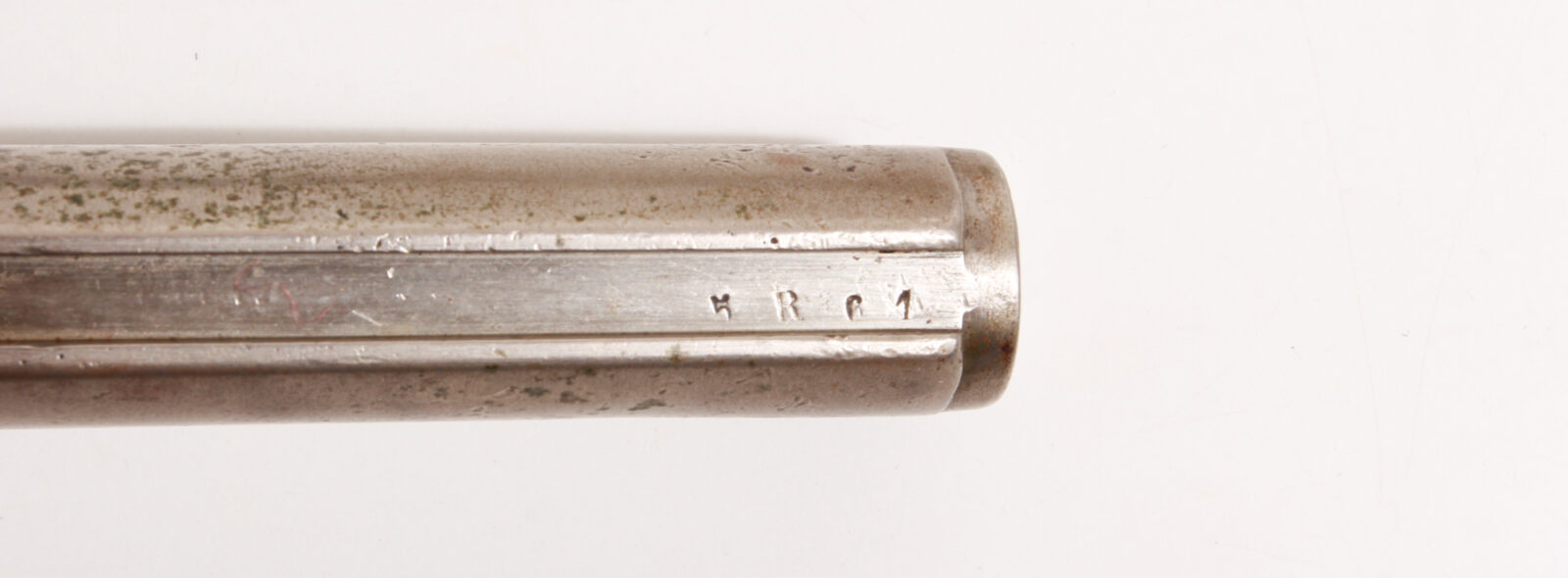 Square blade with crossguard and serial number, spring-loaded release button, white metal grip. Guide groove stamped with German regimental marking. Steel scabbard with lanyard hole and ball tip. Length 46.3 cm, blade length 34.3 cm. Blade in very good condition, scabbard with fine, cleaned rust spots. This bayonet, after shortening and modification of the scabbard, was used by the Wehrmacht and the Volkssturm.