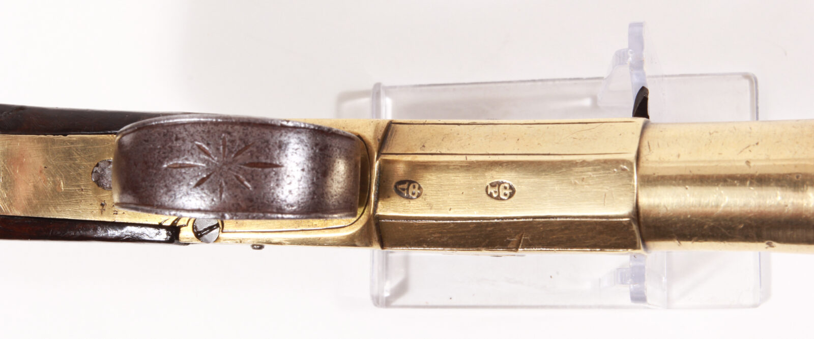 One-piece brass action with barrel, the barrel with cannon balusters and a trombone muzzle. Octagonal chamber, action engraved with weapon trophies. Opposite side engraved under sunbursts “Dunderdale and Mabson”. Sliding safety, which simultaneously secures the hammer and frizzen. Underside deeply stamped with London proof marks P and V under a crown. Grained walnut stock stamped with owner’s mark “T. Rawling”. Length 17.5 cm. The trombone barrel tapers from 11.5 mm to 16.2 mm. Dunderdale and Mabson are mentioned in Birmingham from 1799 to 1803, see Stöckel Vol. 1, p. 317.