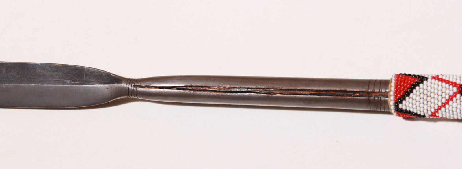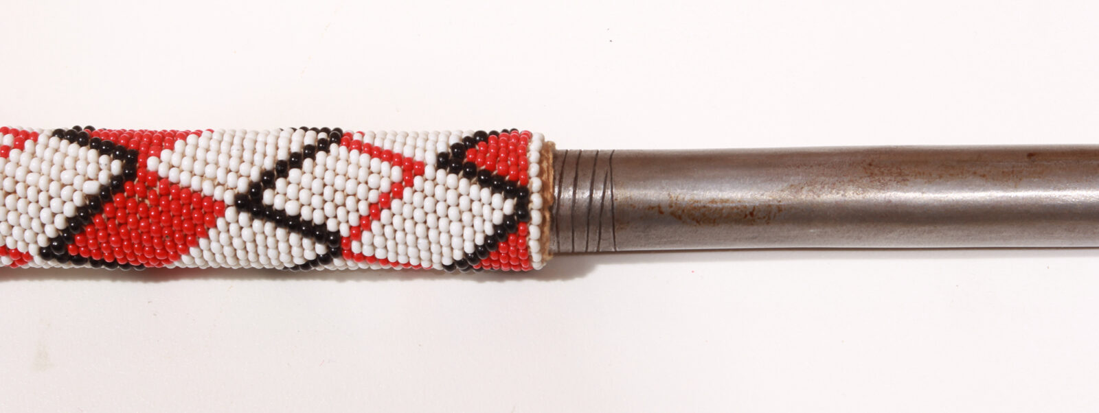 Long, black and white forged blade with an iron spike. The shaft is covered with fine, colored glass beadwork. Very good condition. Length 164 cm.