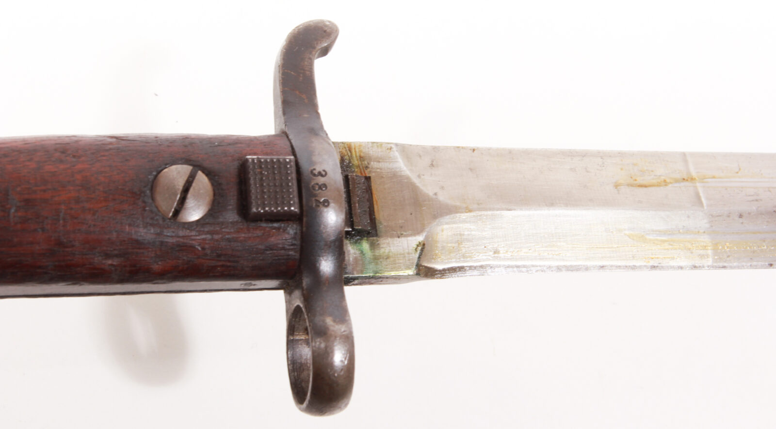 Double-edged blade, sharpened at the tip. Spring-loaded retaining lug. Screwed walnut grip scales, spring-loaded release. Crossguard with deeply stamped regimental numbers. Length 46 cm, blade length 33 cm. Very good condition, the blade still in its original grease.