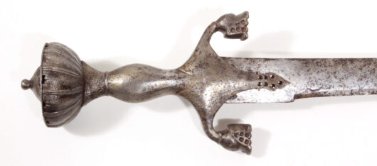 Strongly curved, narrow, single-edged blade. Chiseled handle with stylized dragon heads, clasps with decorative perforations. Finely fluted pommel. Length 82 cm, blade length 68 cm. Surface spotted with cleaned rust pits.