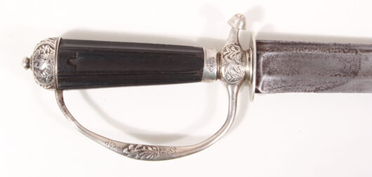 Wedge-shaped blade, double-edged in the point, with a wide fluting in the center and a narrower one above, tang signed “Vincent”. The guard, bow, and pommel are decorated with raised, carved and engraved birds, trees, and bushes. Finely fluted ebony grip. Length 68 cm, blade length 55 cm. A cleaned rust spot is present on […]