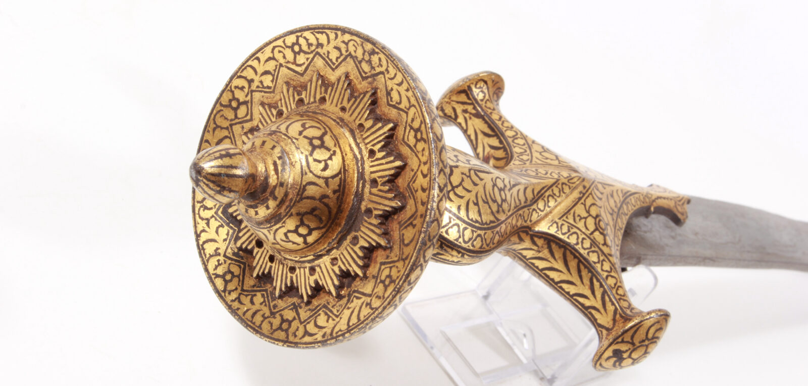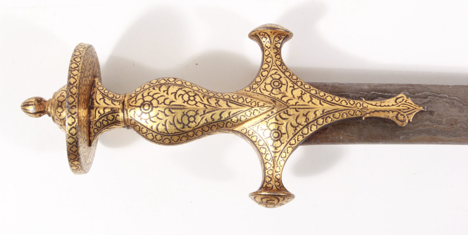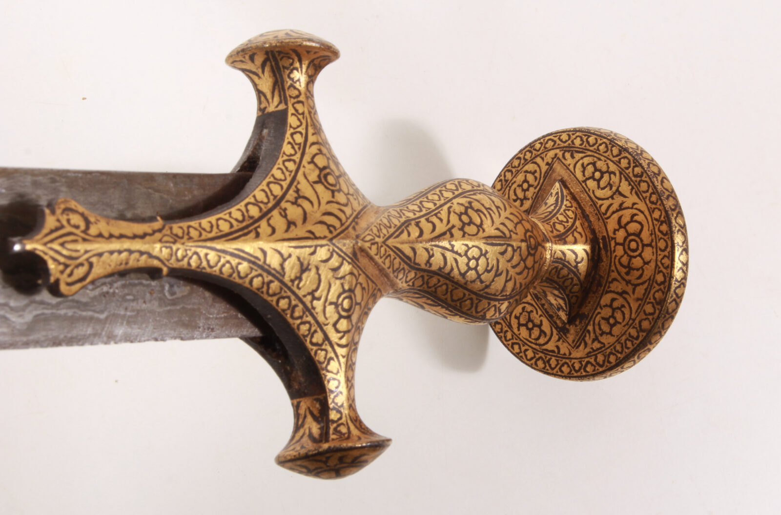 Single-edged Damascus steel saber blade, etched with a very fine Damascus pattern. The hilt, guard, bolsters, and pommel are lavishly inlaid with delicate gold decoration in the form of flowers and leaves. Overall length 82.5 cm, blade length 70 cm. Very good condition. The gold is almost entirely intact.