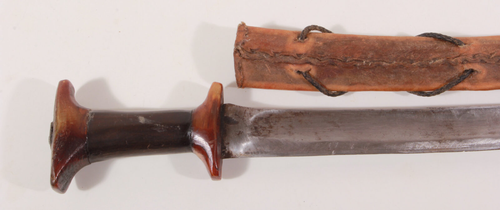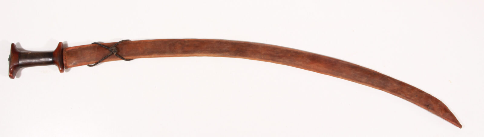 Strongly curved saber blade with broad fluting, three-piece shotel hilt made of solid horn. Scabbard made of light brown rawhide with a green, braided leather loop, neatly stitched on the back. Length 98 cm, blade length 87 cm. Blade with cleaned spots and various resharpenings, otherwise very good condition. This is a period piece, not a bazaar find.