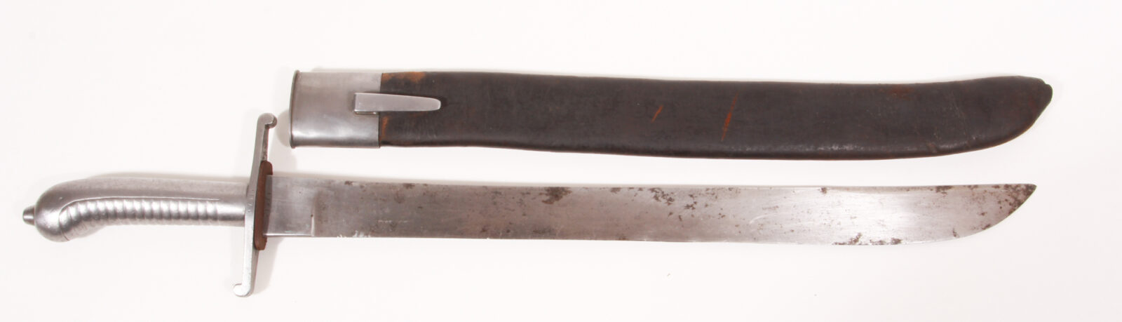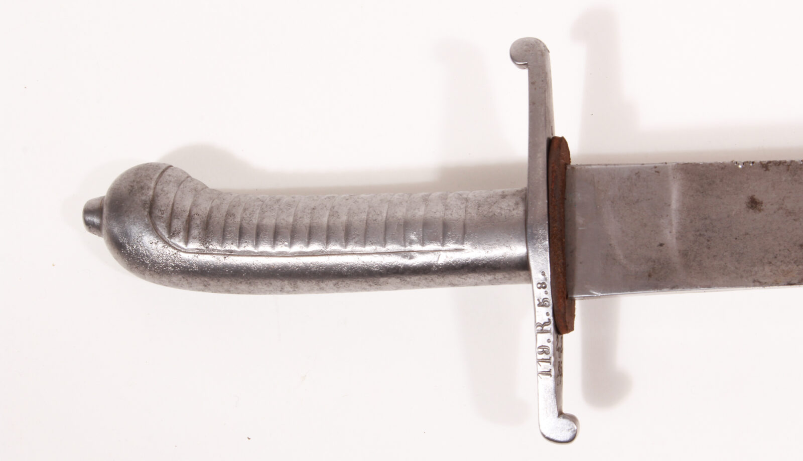 Wedge-shaped blade, double-edged at the point, tang with serial number, crossguard with regimental stamp 119.R.5.8. Grenadier Regiment Queen Olga (1st Württemberg) No. 119 Stuttgart. Underside with smith’s mark and other stamps. Grooved steel grip. Leather scabbard with throat plate and carrying hook. Length 60.6 cm. Blade length 46.6 cm. Blade with slight staining, leather scabbard seam slightly opened at the point, but still secure.