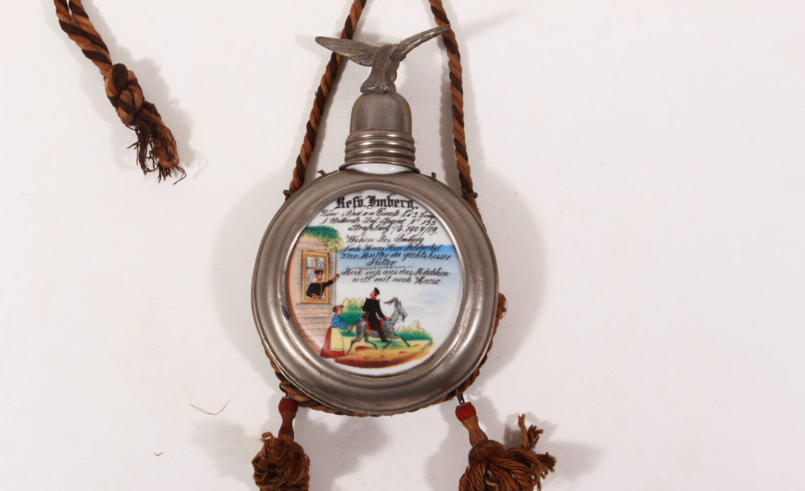 Very well-preserved porcelain flask, finely painted with scenes from military service. Circumferentially hinged, nickel-plated metal ring. Reservist Imberg, 2nd Company, 1st Alsatian Infantry Regiment No. 132, Strasbourg. Stopper with a flying eagle. Length 20 cm. Except for two small dents in the metal ring, in very good condition. Complete, colored carrying cord.